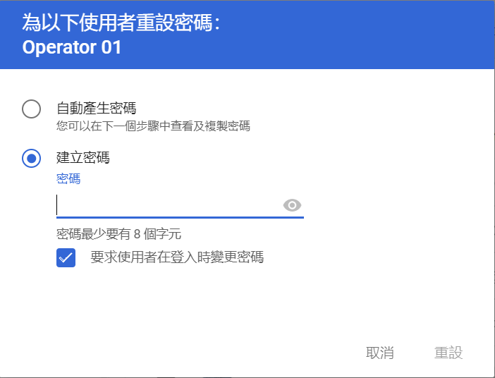 - 您可以選擇「自動產生密碼」或「建立密碼」。選擇前者,系統會自動產生一組密碼;後者則是管理員手動輸入新密碼,另外也能要求使用者登入時再度重設一次密碼。