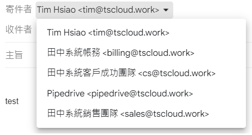 - 完成之後,之後於Gmail寄信時,寄件人的欄位會變成下拉式選單,您可以選擇用別名地址寄出信件。