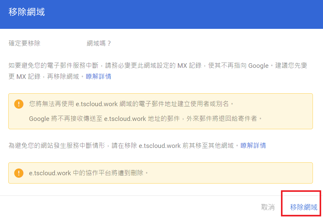 - 找到要刪除的網域,點選右手邊藍色的「移除」。