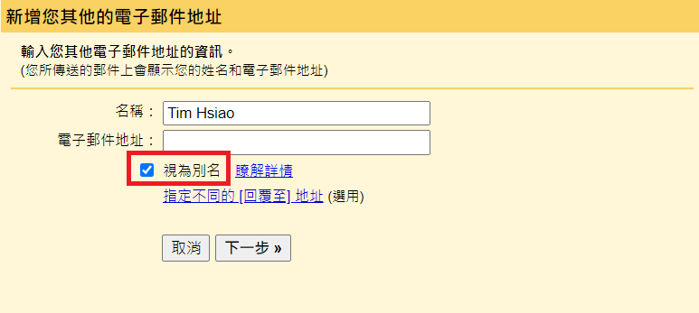 - 畫面會跳出新增視窗,請輸入寄信名稱和別名地址。