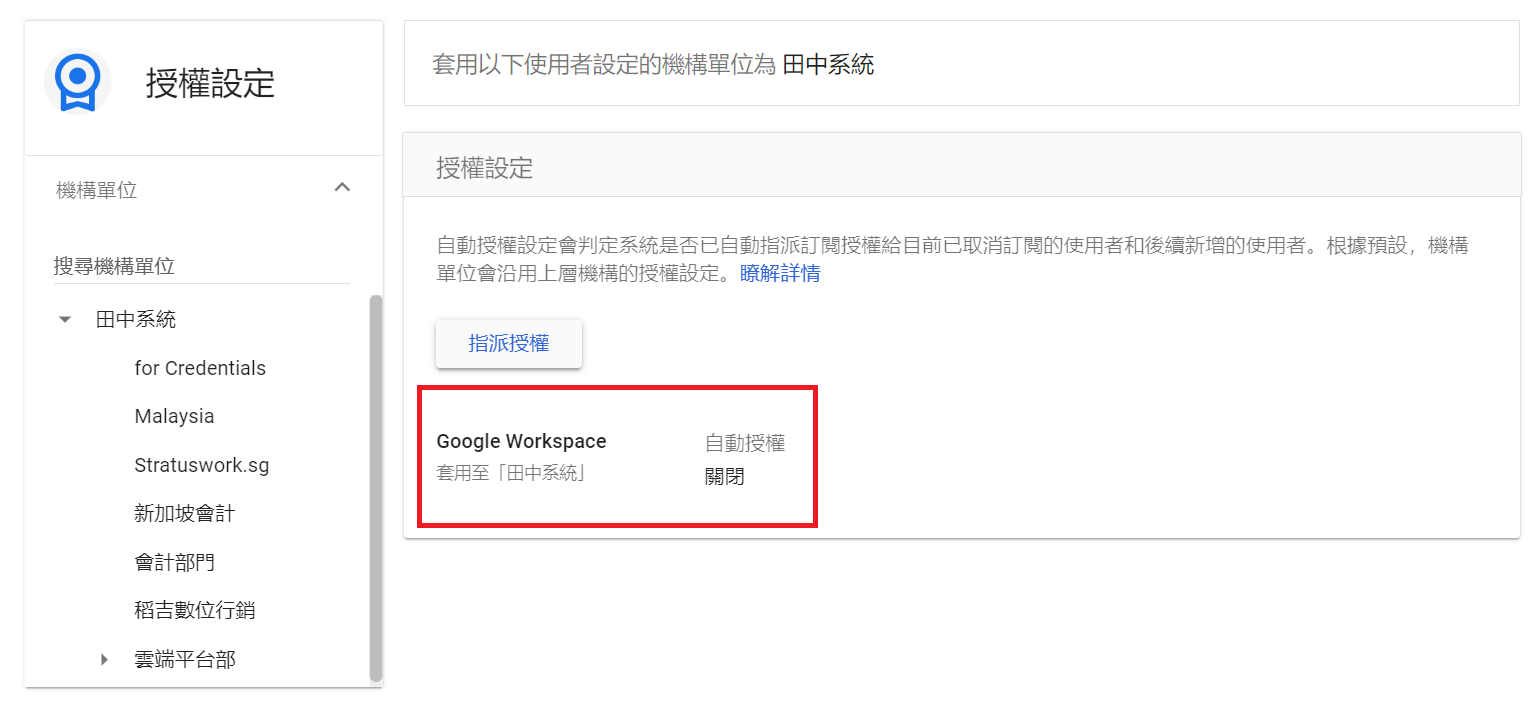 如果貴公司只有購買一種Google Workspace版本的帳號,那系統通常會預設開啟「自動授權」。若貴公司的Google Workspace有混用兩個以上的版本,那可能就得手動進行授權指派囉。