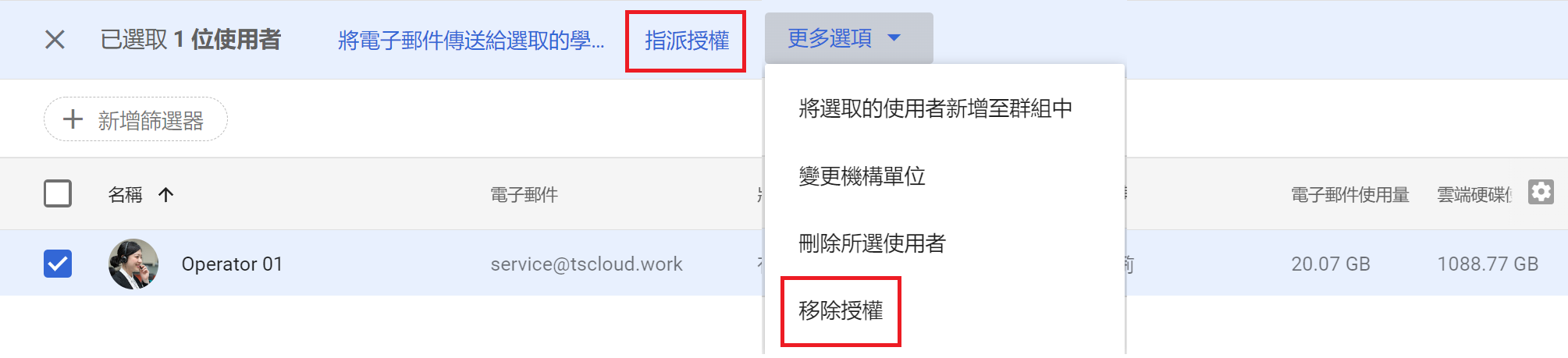 - 您會發現畫面上排出現藍色面板,可以點選「指派授權」或是點選「更多選項」後,選擇「移除授權」。