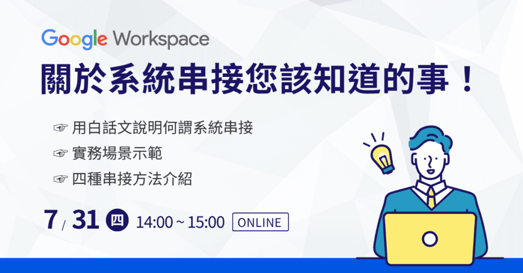 過去與客戶溝通時,發現大家有聽過 Google Workspace 可以串接其他系統,但因為公司內部沒有工程師,所以想做也不知道該從哪做起,所以我們決定辦一場說明會,幫助大家更清楚何謂串接,以及您的公司適合哪一種串接方式。
