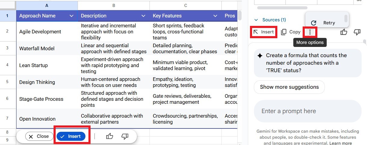 如果您滿意 AI 的回覆,可點選「Insert 插入」到表中,不滿意的話則可以選「Retry 重試」。