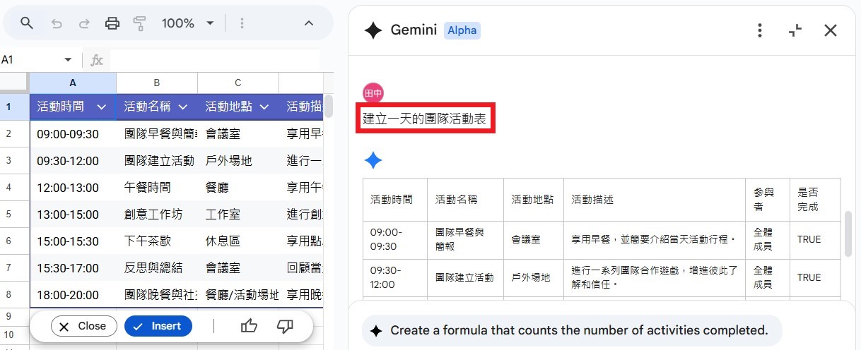 要求 Sheets Gemini AI 建立一天的團隊活動表