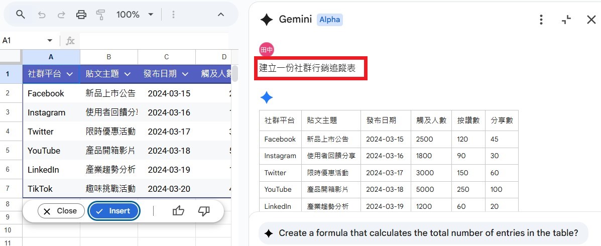要求 Sheets Gemini AI 建立一份社群行銷追蹤表