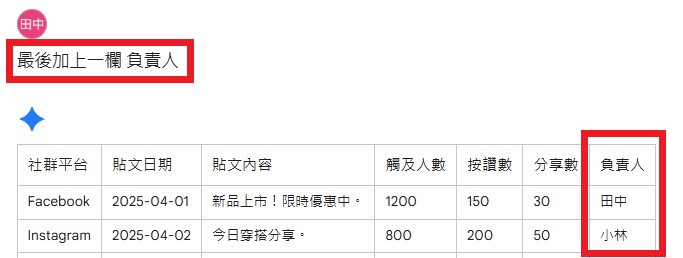 AI 能夠理解前後文的關係,如果這個表格需要修改,可以新增後續提示,例如「最後加上一欄 負責人」。