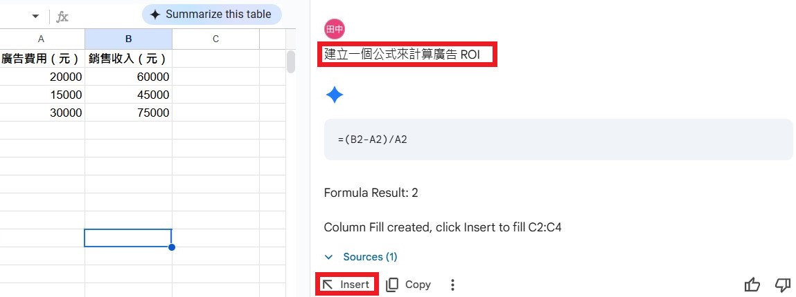 舉例來說,您可以輸入「建立一個公式來計算廣告 ROI」,然後再按 Insert 插入。