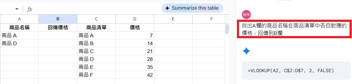 Gemini 就會幫您寫好公式,並將計算後的數值加在新的一欄。