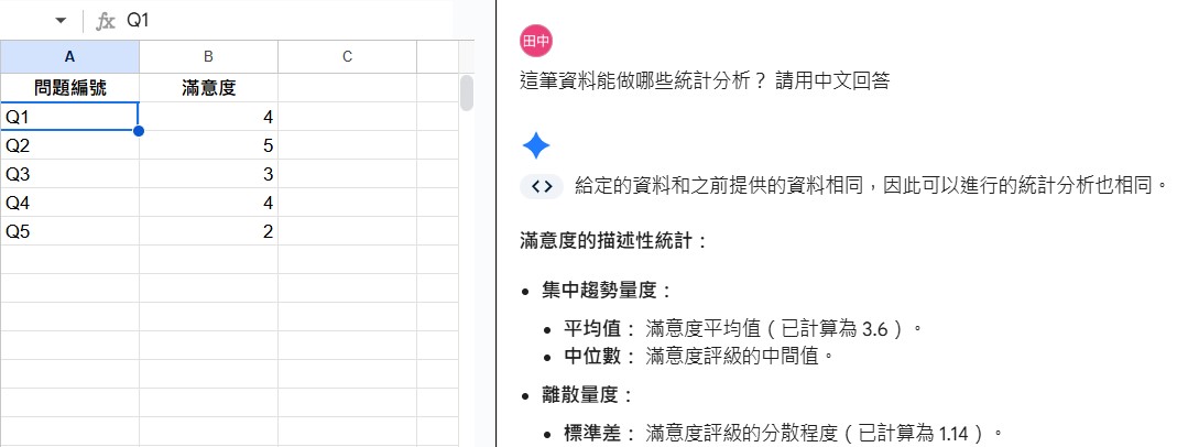 您可以輸入「幫我找出這份資料的趨勢」、「這筆資料能做哪些統計分析?」之類的指令,讓 AI 來為您分析這份資料。