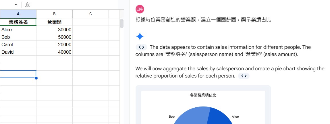 Gemini 可以根據資料自動建立折線圖、圓餅圖等,例如「建立以日期為 X 軸、金額為 Y 軸的圖表」、「做出這筆花費的圓餅圖」。但比較可惜的是,這些圖片並不是 Google Sheets 內建的互動圖表,是固定的、不會隨著數據變動而更新。